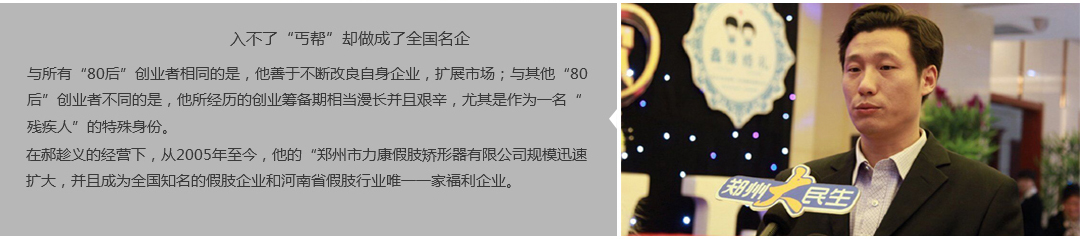 鄭州市力康假肢矯形器有限公司(簡稱力康),是一家專業(yè)從事假肢矯形器的設計、研發(fā)、制作及裝 配的專業(yè)機構。成立于1992年是河南省唯一一家福利企業(yè)。力康下設業(yè)務部、技術部、住院部、康復 部、售后服務部,并配有現(xiàn)代化的裝配車間和功能齊全的訓練大廳,為殘疾朋友康復訓練提供了可靠 保障。總經理穿戴假肢多年,有著豐富的臨床經驗和親身體會;多年來,力康已為全國幾十萬名殘疾 朋友安裝上舒適、美觀、耐用的假肢和矯形器具,使他們更大限度地恢復了正常的工作和生活。“產 品即人品”的質量理念、先進的技術、實惠的價格、完善的售后服務是力康取勝的法寶……